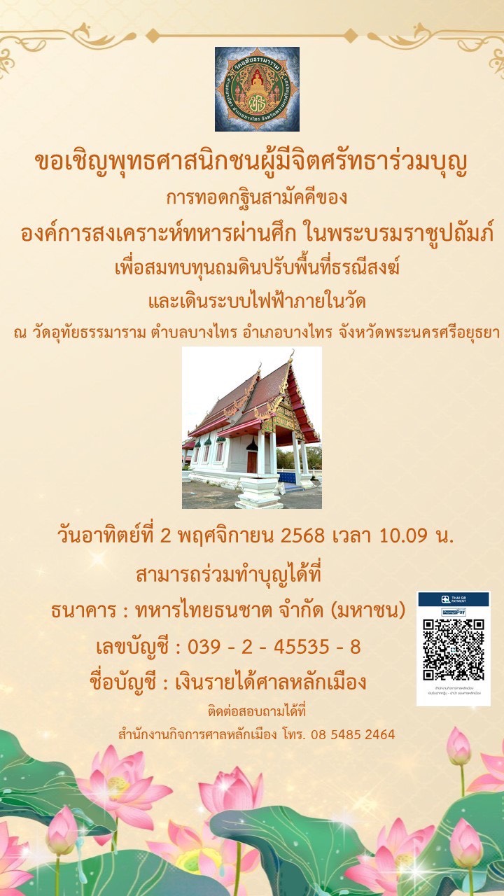 ขอเชิญพุทธศาสนิกชนผู้มีจิตศรัทธาร่วมบุญ การทอดกฐินสามัคคีของ องค์การสงเคราะห์ทหารผ่านศึก ในพระบรมรา...